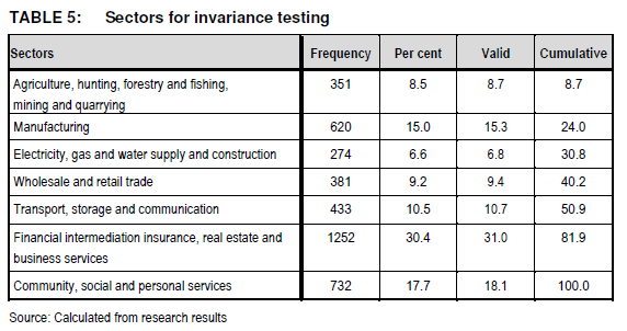 In an effort to assess whether the measurement model was equivalent across sectors, the pattern of factor loadings for each observed measure was tested for its equivalence across the groups. Hair et al. (2010:670) see this as stage 1, namely configural invariance, which determines if the same factor structure exits in all sectors. It was, however, observed that a number of sectors did not contain a sufficient number of responses. The responses were thus grouped into seven sectors as indicated in Table 5.