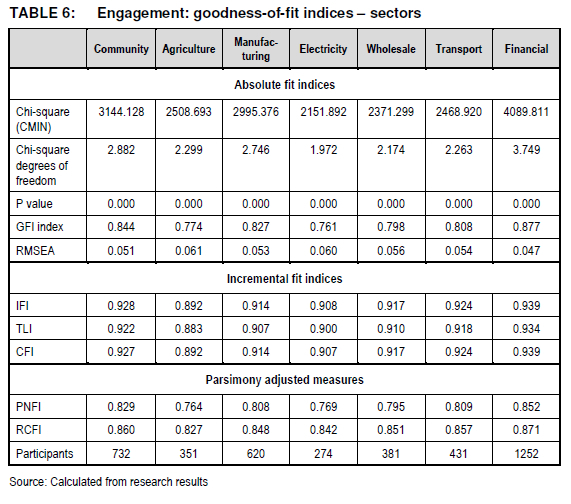 In summary, it would appear that the EEI can be used with confidence to measure the employee engagement constructs across the sectors of agriculture, electricity, wholesale, transport and financial.