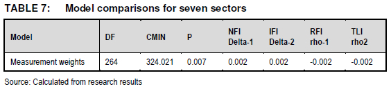 The baseline model used to compare the regression weight equality constraints model was the one obtained from CFA across all sectors. The regression weights for the seven different sectors were constrained to be equal in the model (measurement weights) - the metric invariance stage (Hair et al. 2010:670).