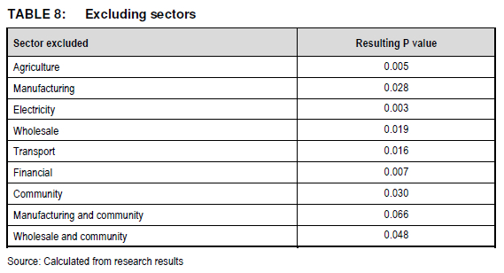 Table 8 indicated that if community and manufacturing are excluded, an insignificant resulting P value is obtained (value > 0.05).