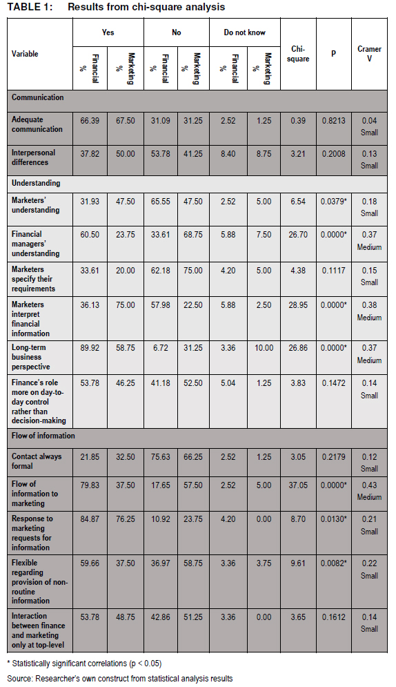 Table 1 provides a percentage breakdown of how each statement was viewed by financial and marketing managers respectively. Only seven items indicated statistical significant relationships as significant p-values were indicated. From Table 1 it can be derived that despite some statistical significant relationships, the effect of these findings are at best "medium".