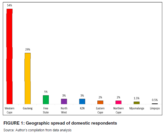 The majority of the domestic respondents originated from the Western Cape (54%) and Gauteng (29%) with Limpopo representing the smallest number of respondents (Figure 1). A possible reason for the large number of respondents from the Western Cape may be justified by their proximity to the geographical locations of the golf courses.