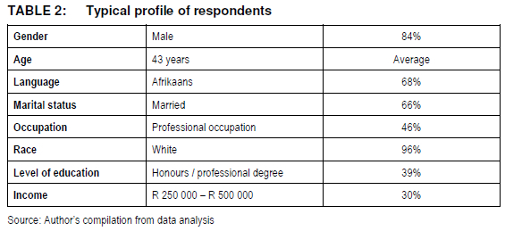 The demographic profile of respondents is represented by a majority of 84% males with an average age of 43 years. The average age of female respondents (16%) is 42 years. The majority of respondents' home language is Afrikaans (68%) followed by English (27%) whilst the home languages of the remaining 5% are German, Norwegian, Portuguese or Swedish. Substantial percentages (66%) of the respondents are married. The dominating race of respondents is white (96%) whilst the remaining 4% consisted of Indian and Coloured respondents with zero African respondents.