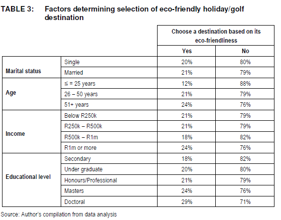 Destination and price were identified as the two most important considerations when choosing a destination. Although the profile of respondents indicated that the majority earned a good income, price still remained an important factor. Results also indicated that golf tourists are very aware of the price of their holiday / golf destination and golf activities. They associate "green" with high prices. Numerous tourists are under the impression that travelling 'green' means that it is more expensive, that they have to stay in primitive accommodation such as tents, make use of old fashioned forms of transport such as bicycles, visit only natural areas such as forests and that only young people can participate in 'green' tourism (Green Motion Travel 2009:Internet).