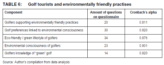 After researching the environmentally friendly practices and preferences of the respondents while participating in golf, it was necessary to test the overall environmental friendliness of the respondents in general. The Cronbach alpha coefficient was used to formulate variables to measure constructs such as the environmental friendliness of golf tourists. It is important that there should be a high degree of similarity amongst the constructs since one common construct/factor is measured. If the items strongly correlate with each other, their internal consistency will be high and the alpha coefficient will be close to one.