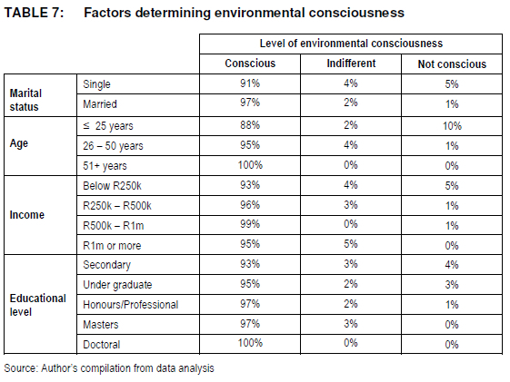 Married respondents show an increased level of environmental consciousness compared to their single counterparts. Environmental consciousness increases with age and levels of education. Levels of income show a similar pattern except for respondents in the R1 million and more per annum income level that shows a slight decline in environmental consciousness.
