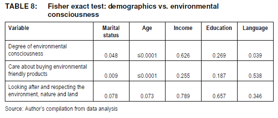 The significance of this conclusion is tested in Table 8 where the relationships between all the variables of environmental consciousness with the profile characteristics are compared. The Fisher exact test was used for such a comparison.