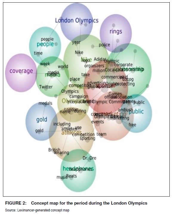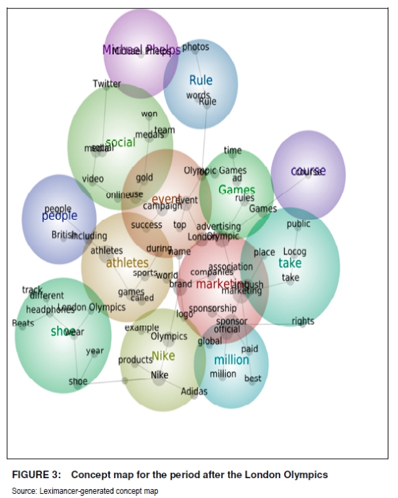 Less significantly and somewhat expected were themes such as the Opening ceremony, the Olympic torch that travelled around various parts of the UK. This is contrasted with themes such as Nike and headphones which appeared as important emergent themes 'during' the Games. These include the concepts of music, Beats and Dr Dre. This period also includes the theme Nike, which includes the concepts Nike (ambushing company) and Adidas (official sponsor).