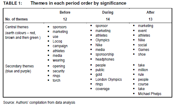 There were some themes found only in the period 'before' such as Locog, campaign and wearing reflecting the pre-Olympics media coverage of the restrictions imposed by LOCOG on the use of symbols including the Olympic rings and words in advertising campaigns and the wearing, by athletes and audiences, of non-sponsor brands.