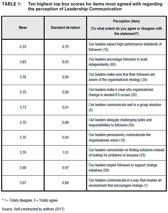 Table 1 depicts that item 15 within the total pool of leadership communication items was most agreed with in terms of perception and was calculated at a mean of 4,33 and a standard deviation of 0,70. This indicated that employees perceived that communicating leaders expected high performance standards of followers. This top box score was followed by item 60 (with a mean of 3,83 and a standard deviation of 0,93) and item 34 (with a mean of 3,76 and a standard deviation of 0,90).