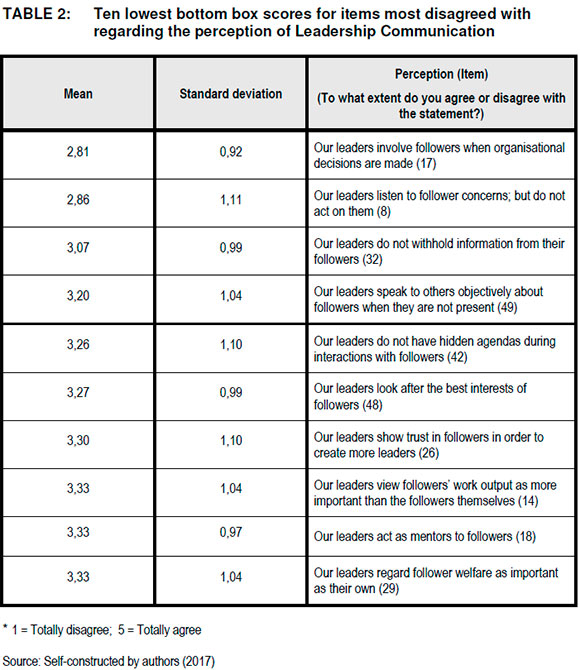 This bottom box score was followed by item 8 (with a mean of 2,86 and a standard deviation of 1,11) and item 32 (with a mean of 3,07 and a standard deviation of 0,99). Within the items employees disagreed with most; the three bottom box scores showed that employees perceived their leaders as individuals: (1) who lack the ability to involve followers when organisational decisions are made; (2) who listen to followers but do not act upon hearing follower concerns; and (3) who might possibly withhold information from followers in their respective organisations. This stands in stark contrast to the idea of a 'communicating' leader.