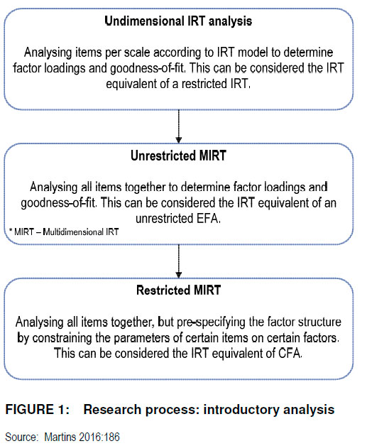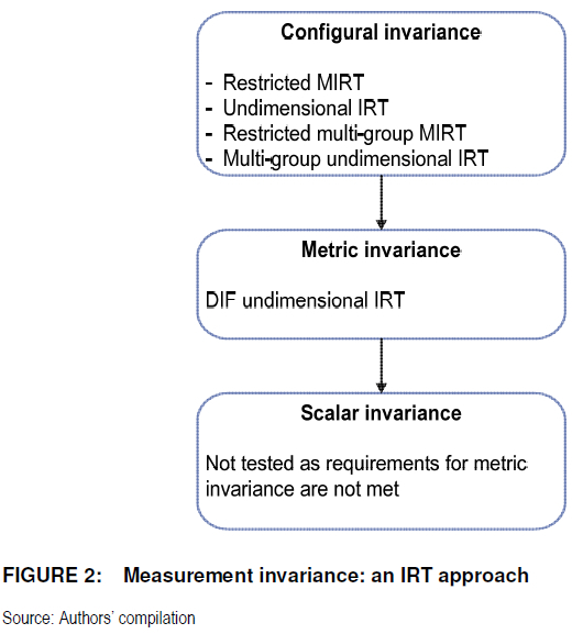 A bottom-up and progressively restricted approach was thus followed in this research to test for measurement invariance (refer to figure 1). That is, the invariance requirements at each step had to be met before moving on to the higher-order form of equivalence (Dimitrov 2010:124). The steps that were followed to determine measurement invariance in this study are graphically represented in figure 2 and explained in the remainder of this section.