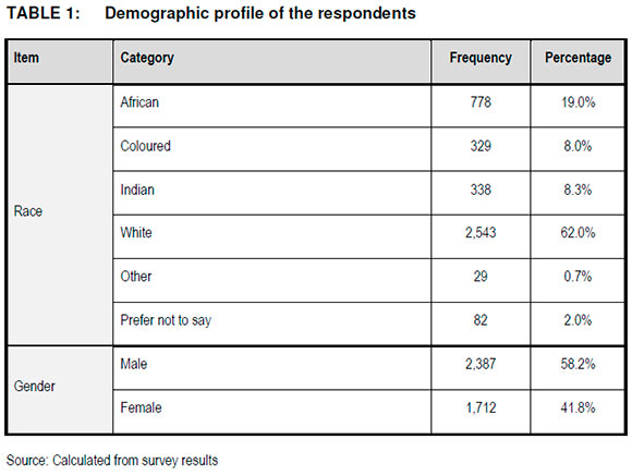 A research company's database of 285 000 working individuals, who represent the profile of the South African working population, was used in this study. Ethical clearance was obtained to conduct the research study and to administer the questionnaire. An electronic survey, administered by iFeedback.co.za, an online data collection portal, was used by means of a mass e-mail invitation over a period of three weeks.
