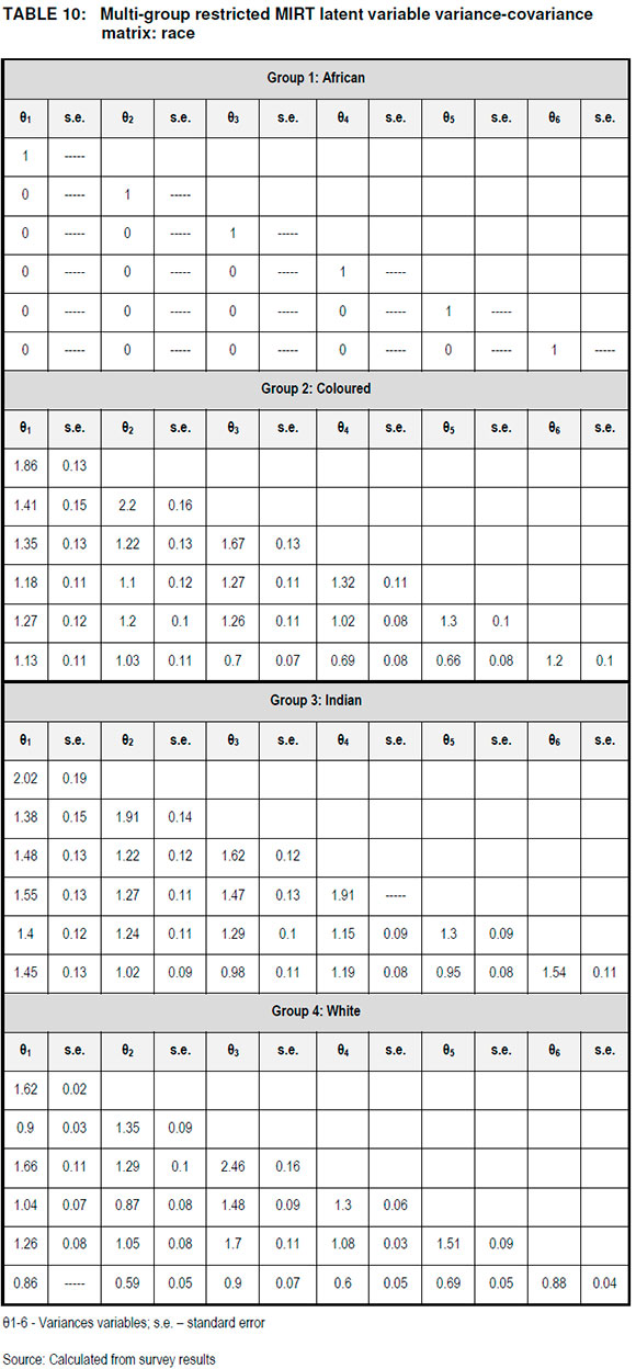 Table 10 demonstrates the covariance between latent variables across the four race groups. As would be expect, most of the latent factors are positively correlated with one another. Unfortunately, no latent covariance can be examined for the African group since the latent means are constrained to zero.