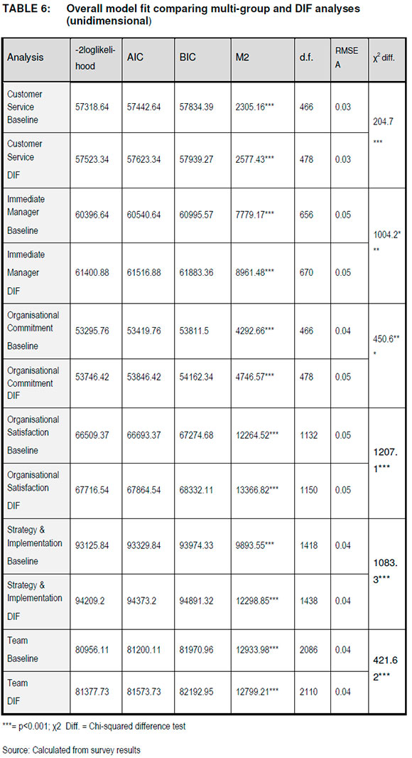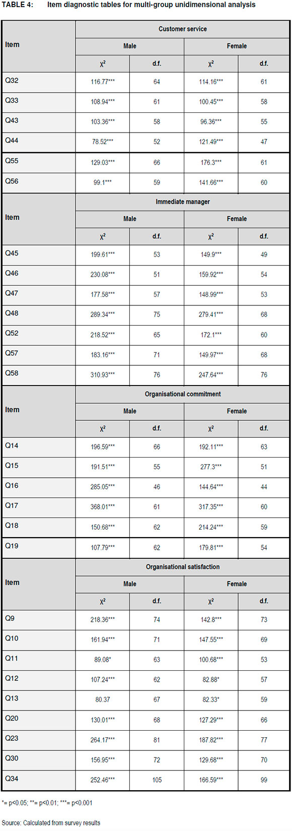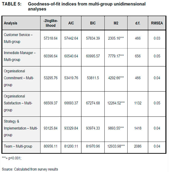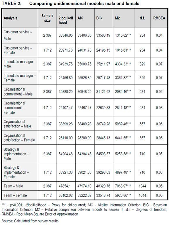 Results of the unidimensional analysis show a difference in male and female models in terms of -2loglikelihood, AIC and BIC. Overall, Customer Service, Immediate Manager and Organisational Commitment show better model fit in terms of the aforementioned indices. However, these may be affected by the difference in sample size, and therefore, M2 and RMSEA should be used to provide a better indication of model fit.