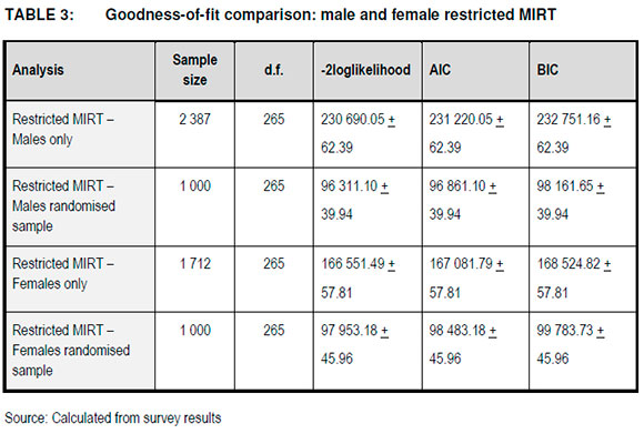 In each case, the results were reported both on the original sample and a randomised sample of equal size. The latter procedure was followed to mitigate any large changes in fit indices that may be due to unbalanced samples. Since the information indices (AIC and BIC) are largely used to compare nested model variance, it is not prudent to compare non-nested models directly. As such, the differences in these indices between the four models in Table 3, may not be very informative. However, the -2loglikelihood can be compared. Although the original male and female samples differ quite significantly based on the -2loglikelihood index, the balanced and random samples show small differences in overall model fit.