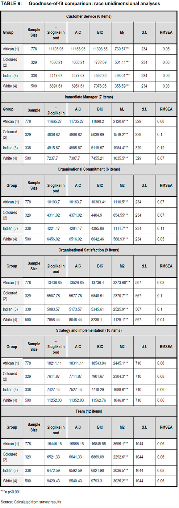 The results revealed that the assumption for metric invariance does not hold across ali six sub-scales. It was further found that the DIF for race is less problematic than for gender. Eight items demonstrated DIF across gender. The Organisational Commitment, Immediate Manager and Strategy and Implementation sub-scales demonstrated the highest degree of invariance for race.