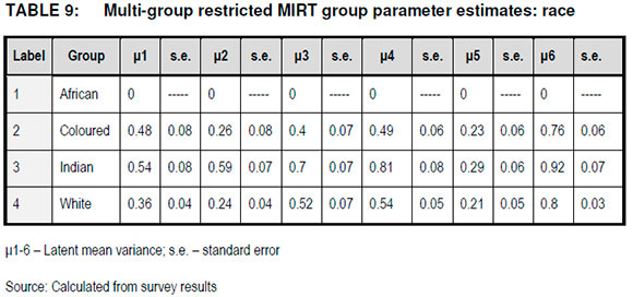 Table 9 demonstrates the latent mean of the reference group (African) was constrained to zero for comparative purposes. Since all the latent mean values for the Coloured, Indian and White groups are positive, it would suggest that these groups have higher levels of endorsement on the six dimensions of engagement. It is important to remember that it is not prudent at this point to compare the latent mean scores of groups since measurement invariance has not yet been demonstrated. This will only be possible after the DIF analysis has been concluded.