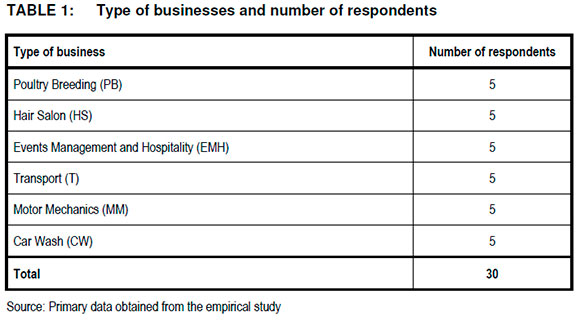 The 30 micro and small entrepreneurs who participated in this study were compiled by the researcher using the snowball sampling technique. According to Cooper and Schindler (2008:170), snowball sampling is where participants refer researchers to others who have characteristics, experiences, or attitudes similar to or different from their own. With the snowball sampling approach, the researcher makes initial contact with people who are relevant to the research topic and then uses those to establish contacts with others. In this particular study, the identification of one imitating micro and small entrepreneur led to the other. Purposive sampling technique was also utilised where specific sectors were targeted and respondents would refer the researcher to their colleagues (Bryman 2012:202, 418).