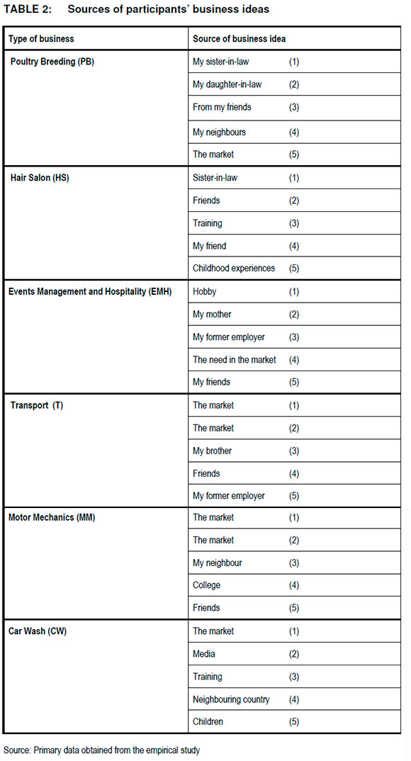 The researcher started off by investigating the sources of the participants' business ideas in order to determine how creative the participants were; whether they had come up with original business ideas or not. Their responses are shown in Table 2.