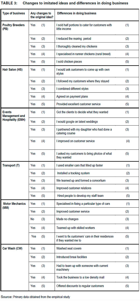 Results in Table 3 show that 29 out of 30 respondents affirmed that they had made changes to the imitated ideas; a sign that these entrepreneurs were aware that duplicative imitation was not going to work for them. Only one respondent from the Motor Mechanics indicated that he had not made any changes due to lack of technical know-how.
