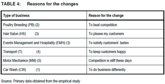 These findings tally with Okpara (2007:9)'s views that in a competitive business environment there is a need to seek out new opportunities and innovate. Without innovation an enterprise and what it provides quickly become obsolete, which is what these micro and small entrepreneurs have attempted to do through these changes.