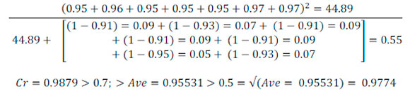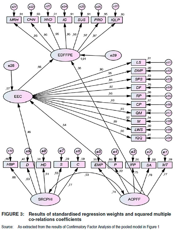 It is the conventional statistical rule that average shared variance (ASV) < √(Ave indicates good discriminant and convergent validity and reliability of the entire pooled model (Kenny et al. 2014:17). In terms of the overall discriminant and convergent validity and reliability of the pooled model in Figure 1, the analysis of the results in Figure 3 suggests that ACPFF: (ASV)= 0.48333 < √(Ave - Acpff = 0.72356) = 0.85062, SRCPHI: (ASV)= 0.48333 < √(Ave -Srcphi = 0.56936) = 0.75456, EEC: (ASV)= 0.48333 < √(Ave - EEC = 0.57543)= 0.75857, and EDFFPE: (ASV)= 0.48333< J(Ave - Edf fpe = 0.95531) = 0 .9774.