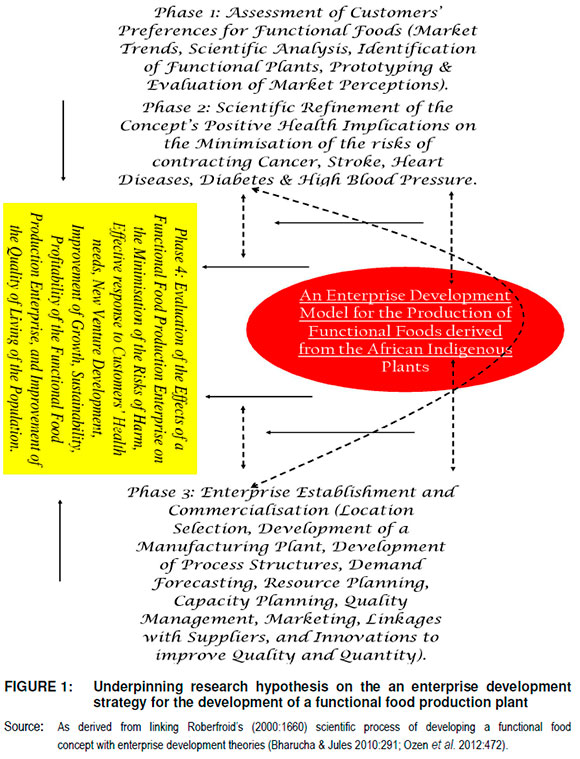 An enterprise development strategy linking science with business applications moderates effective development and commercialisation of a functional food production plant. However, as most theories agitate a largely scientifically skewed process, poor interplay between science and business applications often undermines effective development and commercialisation of functional foods derived from a variety of indigenous African plants.