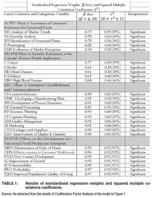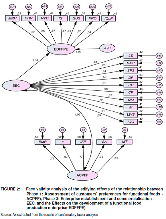 With all their associated variables, it is quite evident that the results of confirmatory factor analysis supports the fundamental business logic in Figure 1 that the process for the development and commercialisation of a functional food production plant is predicted by: the assessment of customers' preferences for functional foods (ACPFF), scientific refinement of the concept's positive health implications (SRCPHI), enterprise establishment and commercialisation (EEC), and assessment of the effects of such a process on the development of a functional food production enterprise (EDFFPE).