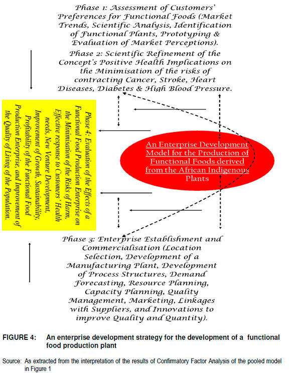 Even if such a scientific process leads to the development and establishment of a functional food production plant, lack of integration of certain critical business development strategies tends to limit the sustainability of such a production plant. Contrary to such scientifically skewed process of functional food development, confirmatory factor analysis indicated a four steps' model to facilitate effective interplay between science and business applications in the process for the development of a functional food production plant. These four steps encompass assessment of customers' preferences for functional foods, scientific refinement of the concept's positive health implications, enterprise establishment and commercialisation, and evaluation of the effects of such a process on the development of a functional food production enterprise.