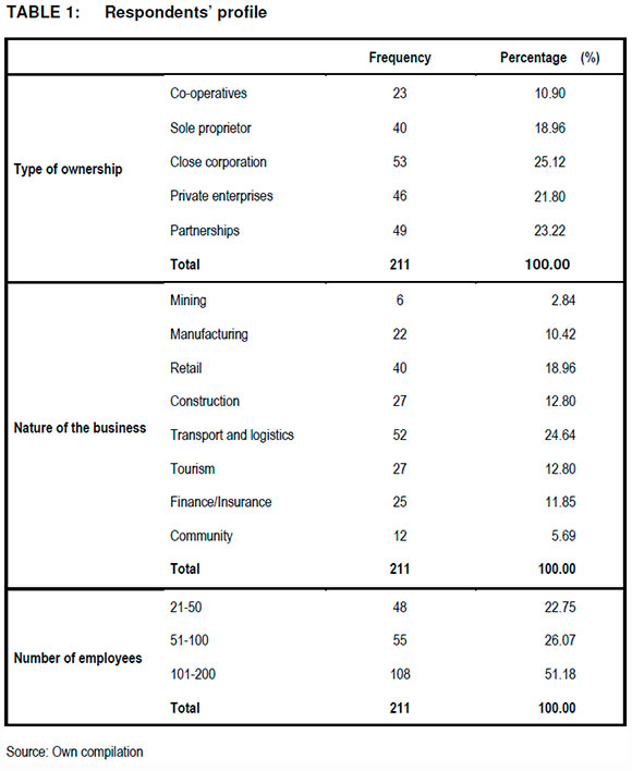 Table 1 shows that the majority of respondents operate in the transport and logistics industry (24%), followed by retail (19%), then construction (13%) and tourism (13%). Further, of the majority, (51%) employ between 101 and 200, indicating that they are medium-sized.