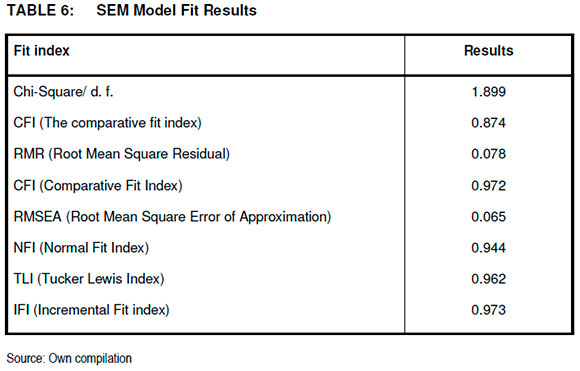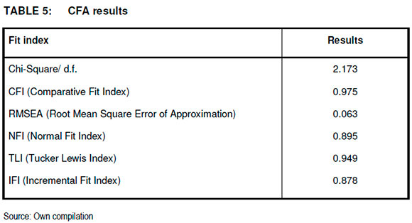 The correlation matrix and the Chi-square CFA test methods were used to check the discriminant validity of the research constructs. When research concepts are different their correlation value should be less than one (1.0). Yet a correlation value between constructs, of less than 0.7 confirms the existence of discriminant validity (Hair, Babin, Anderson & Tatha 2010:762).