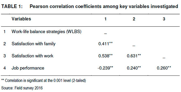 According to the empirical evidence illustrated in Table 1, the WLBS is positively associated with satisfaction with family at (r = 0.411, N = 269, ρ < 0.001). This result indicates that WLBS contribute to employees' achievement of satisfaction with family in the manufacturing sector based on data collected in Lagos metropolis.