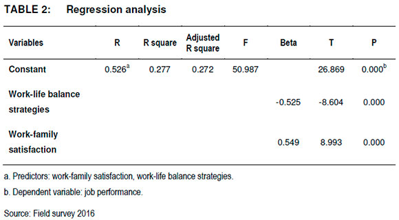 Similarly, satisfaction with work is positively associated with employees' job performance (r = 0.260, N = 269, ρ < 0.001) in the manufacturing industry. Therefore, a higher level of work-family satisfaction is positively related to a greater level of employees' job performance in the Nigerian manufacturing industry. As such, hypothesis two (H2) was supported based on this empirical evidence. It is necessary to consider employees' involvement in the design of WLB policies in the manufacturing industry, having empirically verified the positive influence of work-family satisfaction on employees' job performance. Table 2 presents the result of multiple regression using WLBS and work-family satisfaction as predictors of employees' job performance in the manufacturing industry.