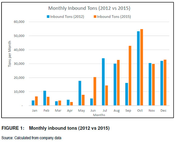 It is seen in Figure 1 that a large proportion of the outbound tons was moved from September to December 2012 showing peaks in October and November 2012. In 2012 the total outbound tons were 260 224 tons and 254 849 tons in 2015, showing a two per cent decrease. This decrease was mostly due to weaker demand in 2015 as a result of lower rainfall. The total volume transported (inbound plus outbound) amounted to 500 350 tons in 2012 and 509 461 tons in 2015, which showed a 1.8 percent increase.