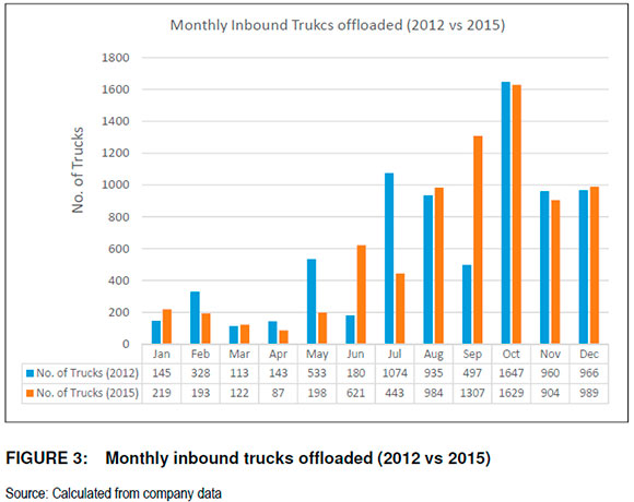 Figure 3 contains the number of inbound trucks offloaded in 2012 and 2015. The maximum number of inbound trucks offloaded for 2012 and 2015 were both in October, 1 647 and 1629 trucks respectively. The total number of inbound trucks offloaded in 2012 was 7 521 and 7 696 in 2015 indicating an increase of 2.33 per cent.