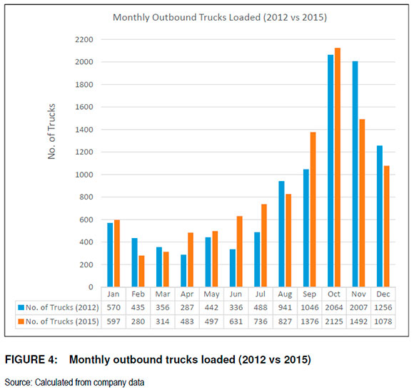 Figure 4 illustrates the number of outbound trucks loaded for the period under review. The maximum number of outbound trucks loaded for 2012 and 2015 were both in the month of October, 2 064 and 2 125 trucks respectively.