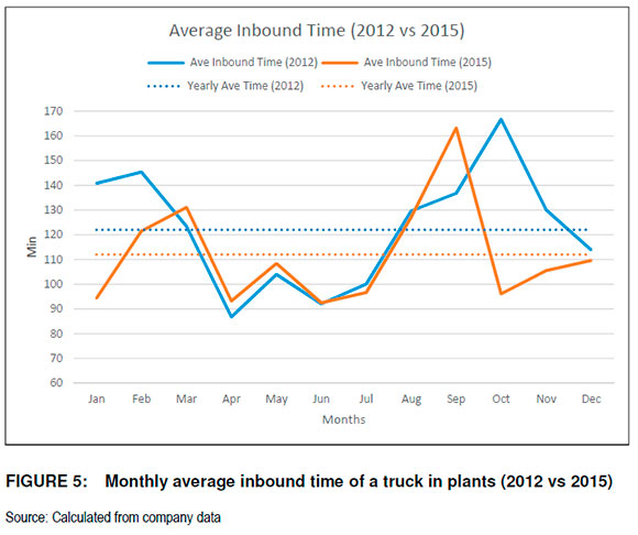 The shortest monthly average time of an inbound truck in 2012 was 87 minutes in April, compared to 93 minutes in April and June for 2015. The annual average inbound time of a truck in 2012 was 122 minutes and 112 minutes in 2015. This indicates a decrease of 10 minutes, an improvement of nearly nine per cent. A decrease in the average time a truck spent in a plant could be viewed as an improvement and needed to be monitored on a monthly basis to ensure continuous improvement.