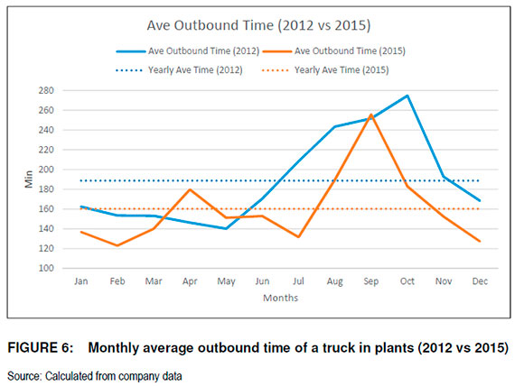 The shortest monthly average time of an outbound truck in 2012 was 140 minutes in May, compared to 123 minutes in February for 2015. In 2012 the annual average time in the plant of an outbound truck was 189 minutes and 160 minutes in 2015. This indicated a decrease of 29 minutes in the annual average time that an outbound truck spent in a plant, an improvement of 15.3 per cent. This improvement allowed transporters to be more profitable as trucks recorded less idle time. The implementation of the TMS allowed the number of trucks loading for the day to be monitored, which assisted in planning to expedite the trucks scheduled for inbound or outbound transport.