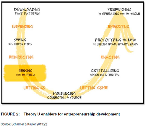 South African students often face obstacles in the entrepreneurial process that discourage them from becoming entrepreneurs, to the overall detriment of youth entrepreneurship in this country. Higher education institutions can play an important role in strengthening the motivation of prospective entrepreneurs through training programmes that create a stronger bond between internal and external orientation for the individual student and encourage connections and activities across the conventional academic boundaries. Following the stages mapped out in Theory U can potentially develop the introspective capacity that the student needs to connect with his or her source of inspiration in a coalescence between head, heart and hand, which reinforces entrepreneurial self-efficacy, entrepreneurial orientation, entrepreneurial intention and entrepreneurial activity.