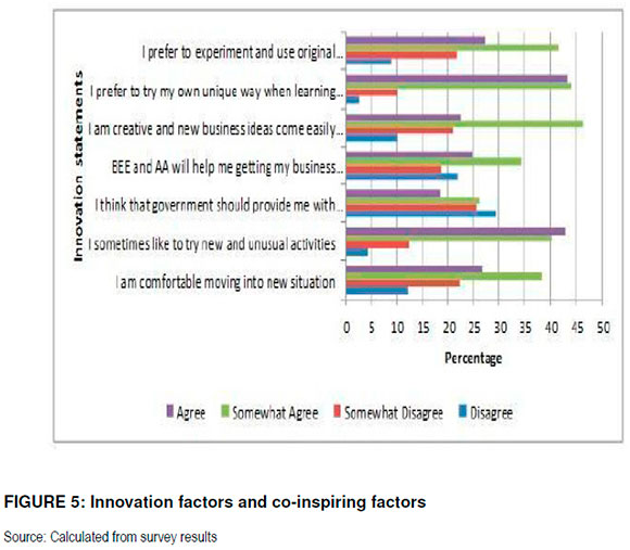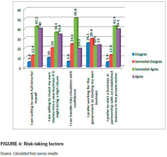 However, 54% of the participants disagreed that they would prefer working for the government rather than starting a business of their own. Participants also indicated that they would be reluctant to co-initiate and co-sense new business opportunities with government. A possible reason for this response might be a prior stimulus that influenced their reactive response field.