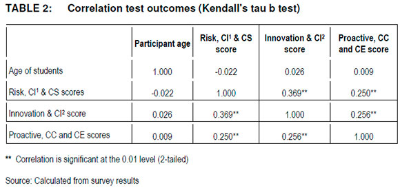 The data were analysed with SPSS version 18. Frequency responses of participants to aspects of IEO factors were determined, and risk, innovation, and proactive scores were compared between male and female students using non-parametric testing for correlation of factors of risk-taking, innovation and proactivity.