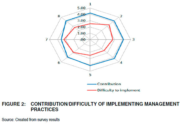 The radar graph in figure 2 indicates the mean level of (1) the importance of the management practice and (2) the difficulty of implementing each practice.