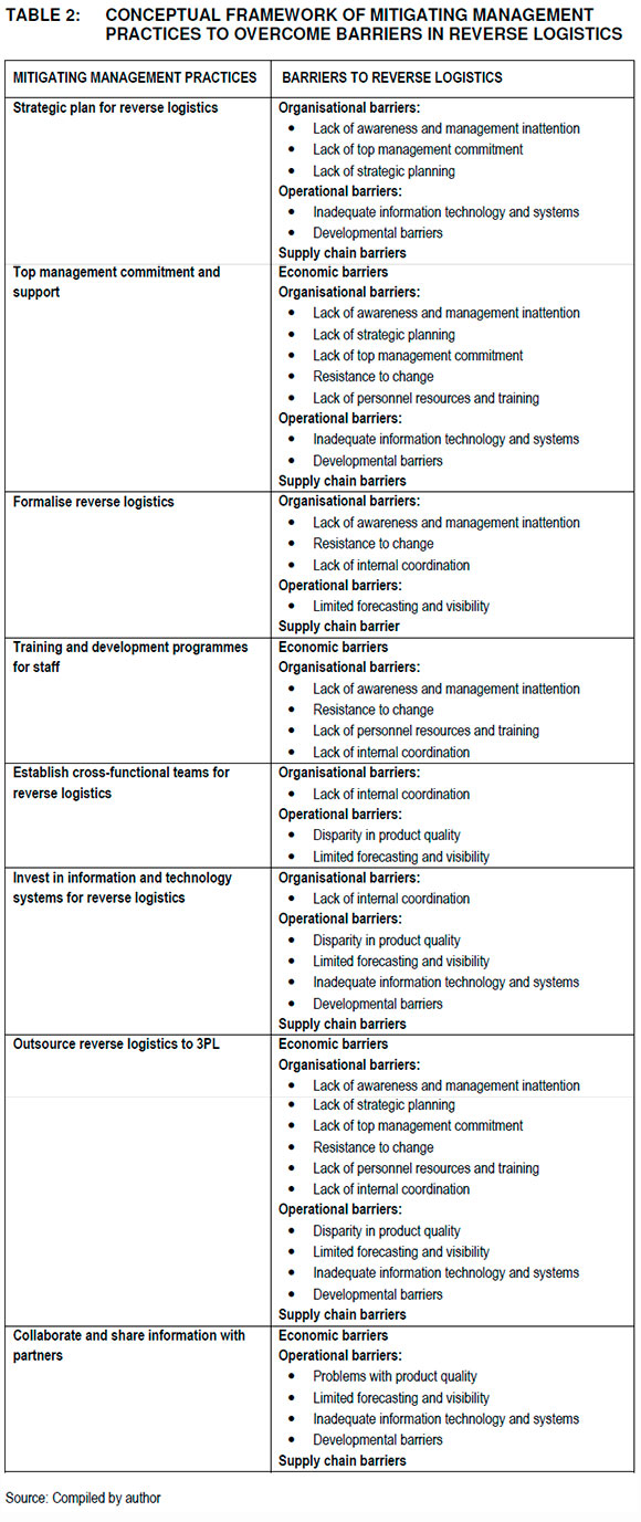 A number of mitigating management practices were identified in literature and a conceptual framework was developed to show how these practices can overcome certain barriers in reverse logistics. For instance, organisational, operational and supply chain barriers can be overcome by developing a strategic plan. In addition, both top management commitment and outsourcing can overcome economic, organisational, operational and supply chain barriers. Training and development programmes for staff can overcome all the organisational barriers. Organisational, operational and supply chain barriers can be overcome by investing in information technology and systems and formalising the reverse logistics process. Finally, economic, operational and supply chain barriers can be overcome by collaborating and sharing information with supply chain partners.