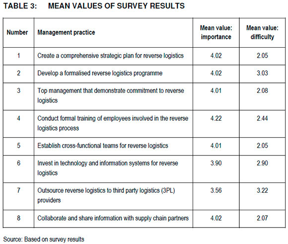 The results also showed that the most important practices included a strategic plan for reverse logistics, training of staff and collaboration with supply chain members. Organisations can use this article to identify important barriers in reverse logistics that could apply to them in order to determine the most important management practices to implement.