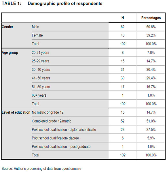 The majority of respondents (60.8%, n=62) were males, which shows that retailers are either owned or managed by males. Respondents over the age of 30 to 40 years (30.4%, n=31) were in the majority compared to the other age groups. Exactly 51 percent (n=52) of the respondents have either completed grade 12 or a have a certificate/diploma.