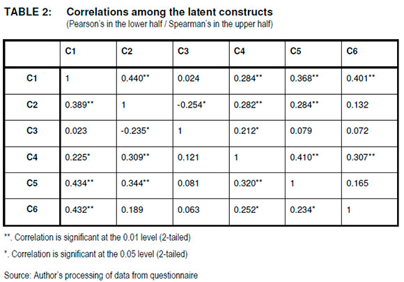 The reliability analysis yielded an overall Cronbach's alpha of 0.78. The individual Cronbach's alpha of each construct was between 0.59 and 0.823. According to Malhotra (2010:319), Cronbach's alpha coefficients of less than 0.50 are deemed unacceptable; those between 0.50 and 0.69 are considered adequate, whereas those above 0.70 are regarded acceptable. To determine the validity of the instrument, the threshold of 0.59 to 0.81 was maintained on the communalities, as well as a cut-off point of 0.30 on the Pearson's correlations as guided by Kim and Mueller (1978). Items classified into higher-level latent constructs to reduce the dimensionality. The constructs that explains over 60 percent of the variation were used for further analyses.