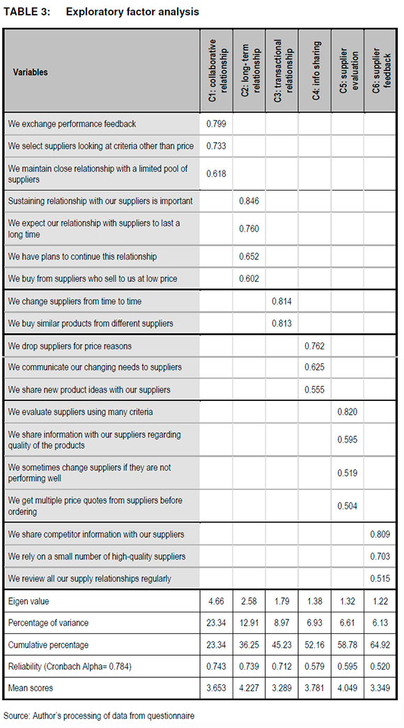 Table 3 shows 24 items and six components. Five of the items were dropped from the analysis due to them not loading satisfactorily. Three items loaded on the first component, which was named collaborative relationships. Four items loaded on the second component, named long-term relationship while component 3 was named transactional relationship and loaded two items. The information sharing was named component 4 and loaded three items followed by component 5, which loaded four items and named supplier evaluation. The last component was named supplier feedback and loaded three items. Table 3 below presents the results for factor analysis.