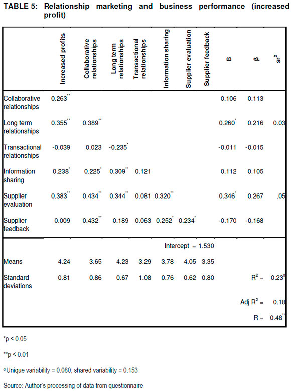 Other studies found that relationship marketing impacts on profitability, market share and customer satisfaction (Adams et al. 2012:34); customer retention, sales growth and profitability (Coviello, Winklhofer & Hamilton 2006:47); customer share and sales growth (Palmatier, Scheer, Houston, Evans & Gopalakrishna 2007:220) and market performance-overall product quality, overall competitive position and overall customer service levels and financial performance, which entails market share, return on assets and average selling price (Hsu et al. 2008:305). In this article, the relationship between relationship marketing and business performance was measured through increased number of customers, increased profits and increased market share.