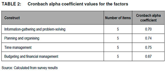 The first section (Section A) of the questionnaire measured respondents' demographic profile. The second section (Section B) measured the planning and administration competencies, namely respondents' information-gathering and problem-solving, planning and organising, time management, as well as budgeting and financial management. Each of the items included in the scales was measured on a five-point Likert-type scale, with 1 -representing 'poor', 2 - 'fair', 3 -'good', 4 -'verygood'and 5 - 'superior'.